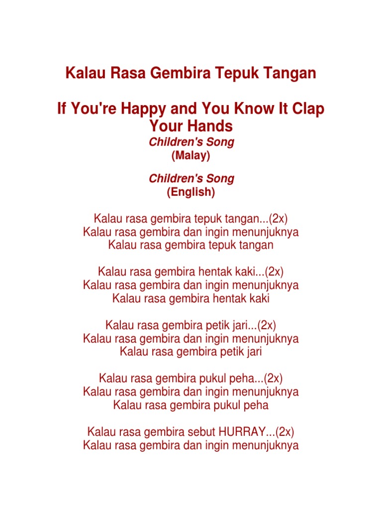 LPMI SDA Lagu Pujian Masa Ini 01 80. Kalau Rasa Gembira Tepuk Tangan Childrens Song Malay Kalau rasa gembira tepuk tangan2x Kalau rasa gembira dan ingin menunjuknya Kalau rasa gembira tepuk tangan Kalau rasa gembira hentak kaki2x Kalau rasa gembira dan ingin menunjuknya Kalau rasa gembira hentak kaki Kalau rasa gembira petik jari2x Kalau rasa gembira dan ingin. View KEPERLUAN DAN KEHENDAKpptx from JPM 1103 at Institut Pendidikan Guru Kampus Batu Lintang.
